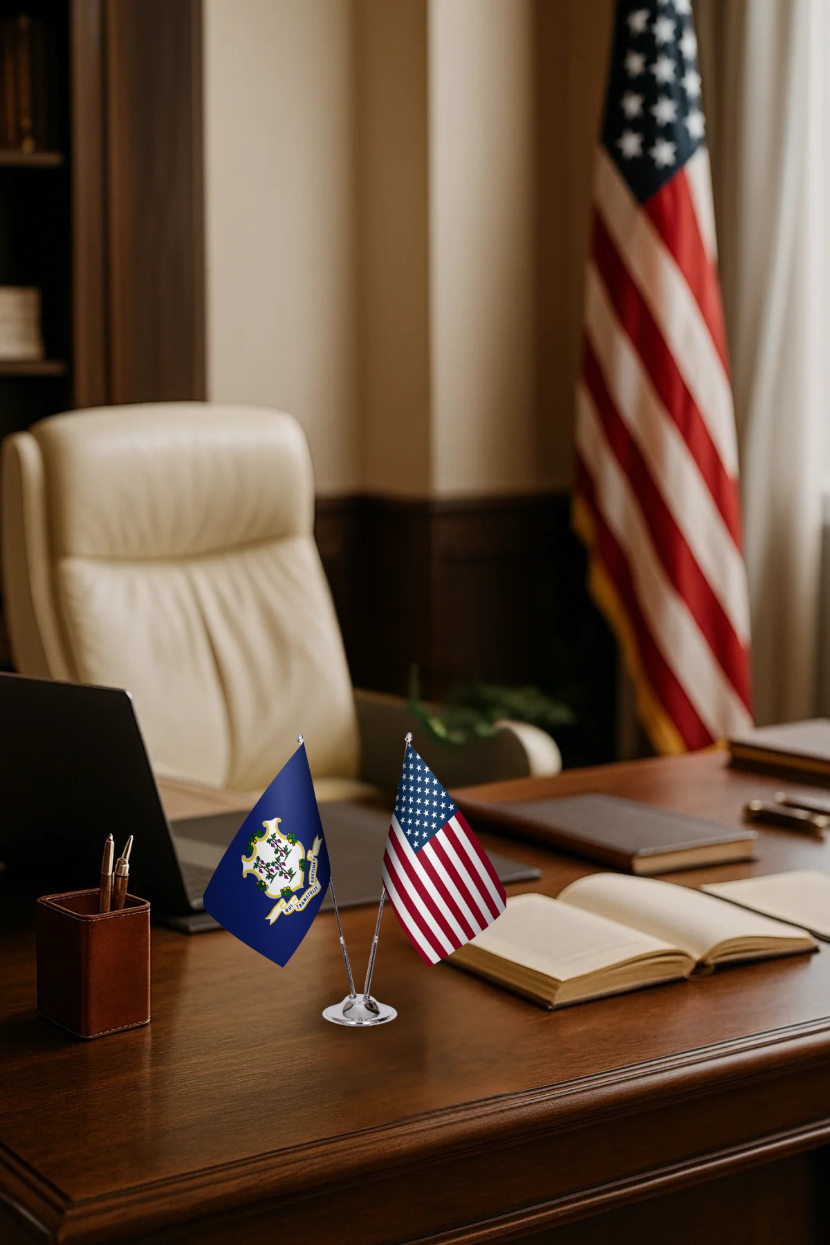Celebrate your heritage and patriotism with this Connecticut & U.S. Flag Desk Set – a perfect combination of the state flag and the American flag side by side.