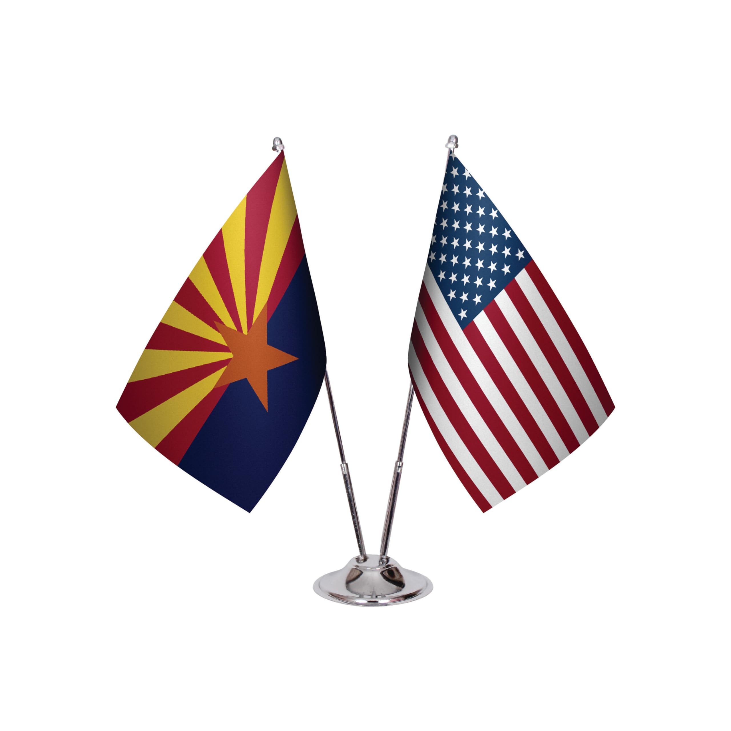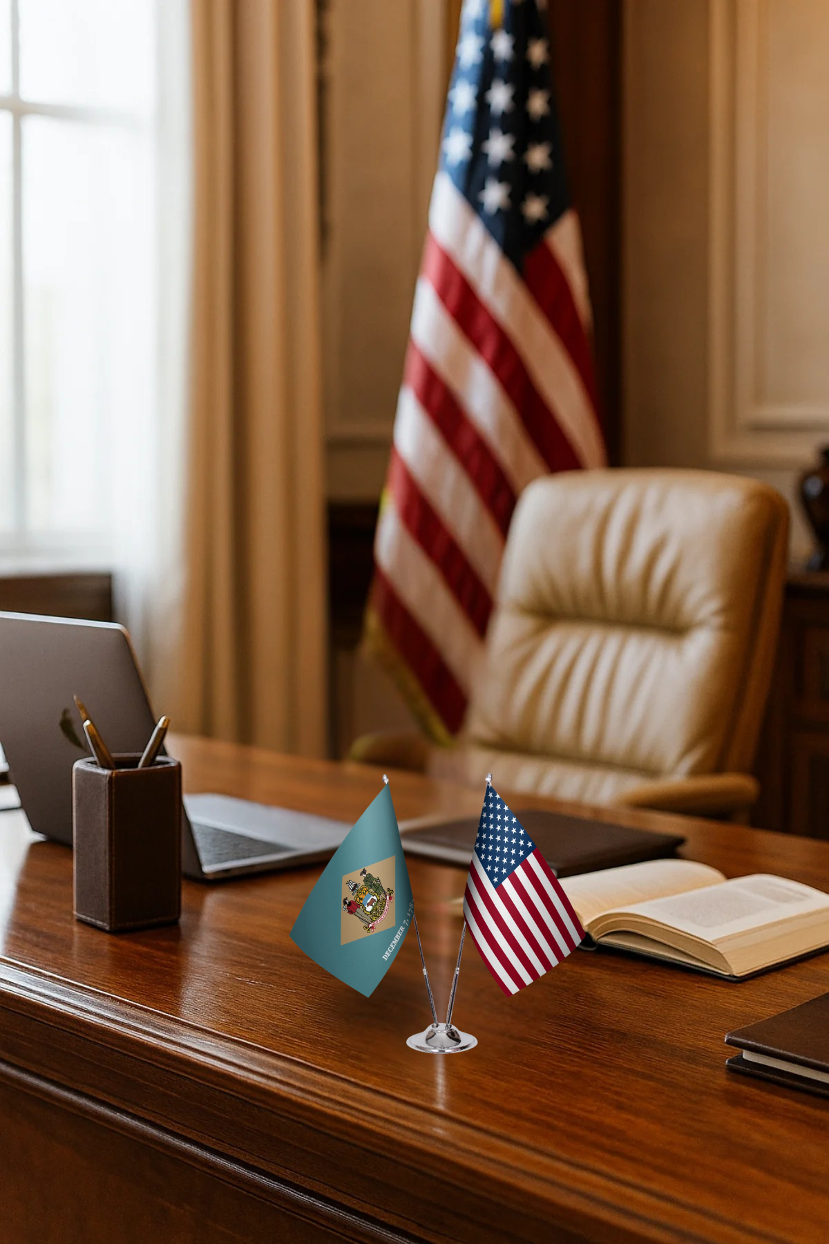 Celebrate your heritage and patriotism with this Delaware & U.S. Flag Desk Set – a perfect combination of the state flag and the American flag side by side.