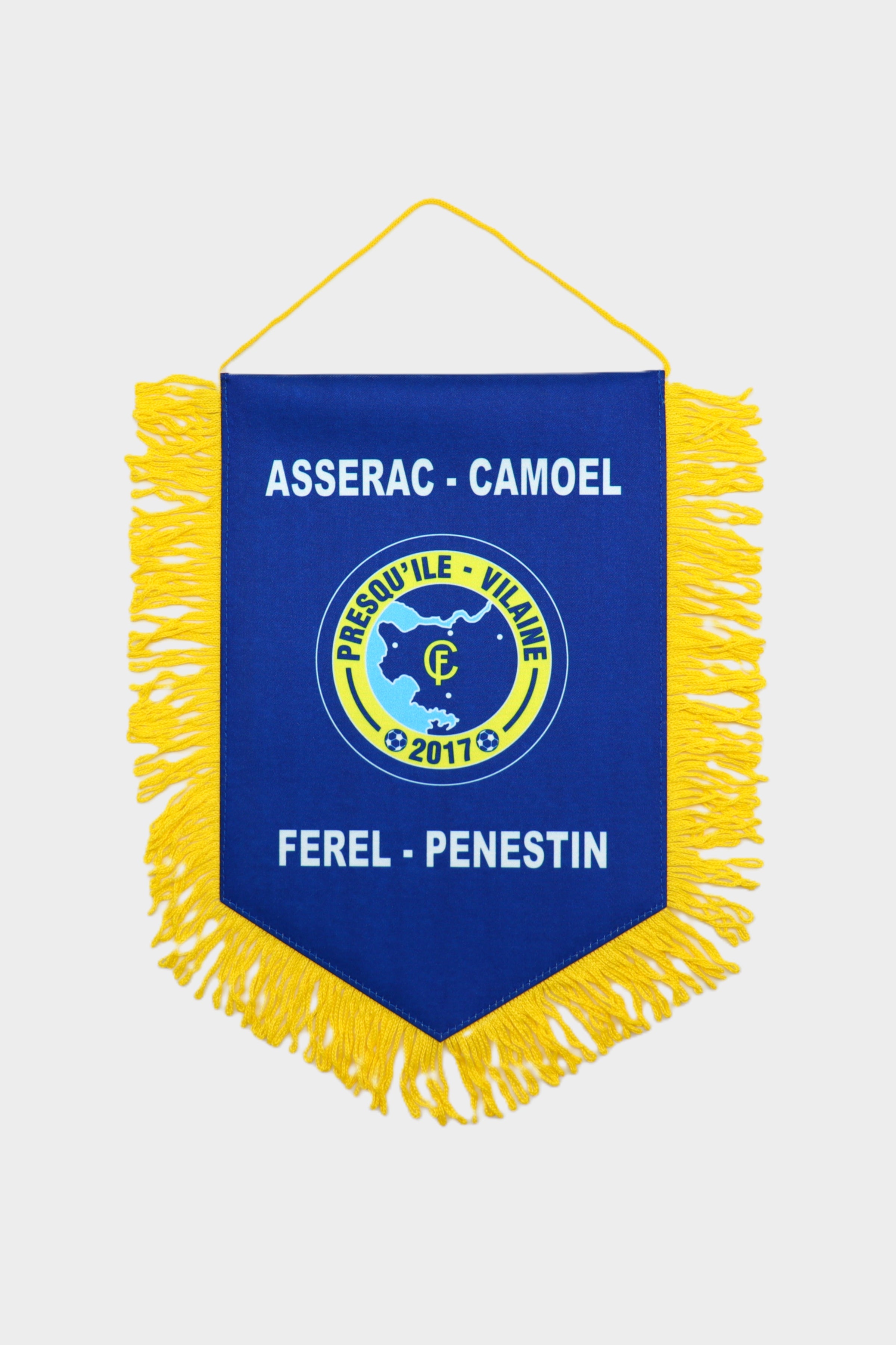 Premium doppelseitiges Wimpelbanner aus Kristallsatin, fünfeckiger Schnitt, gelb mit Fransen