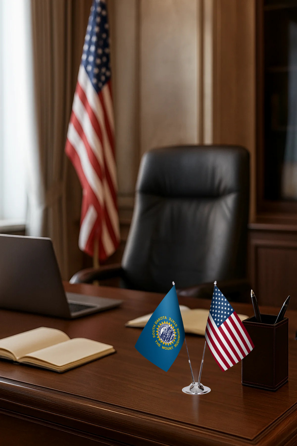 Celebrate your heritage and patriotism with this South Dakota & U.S. Flag Desk Set – a perfect combination of the state flag and the American flag side by side.