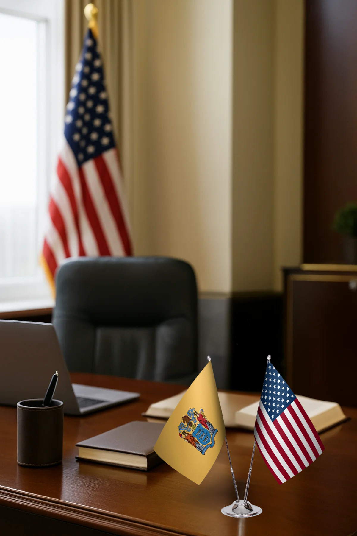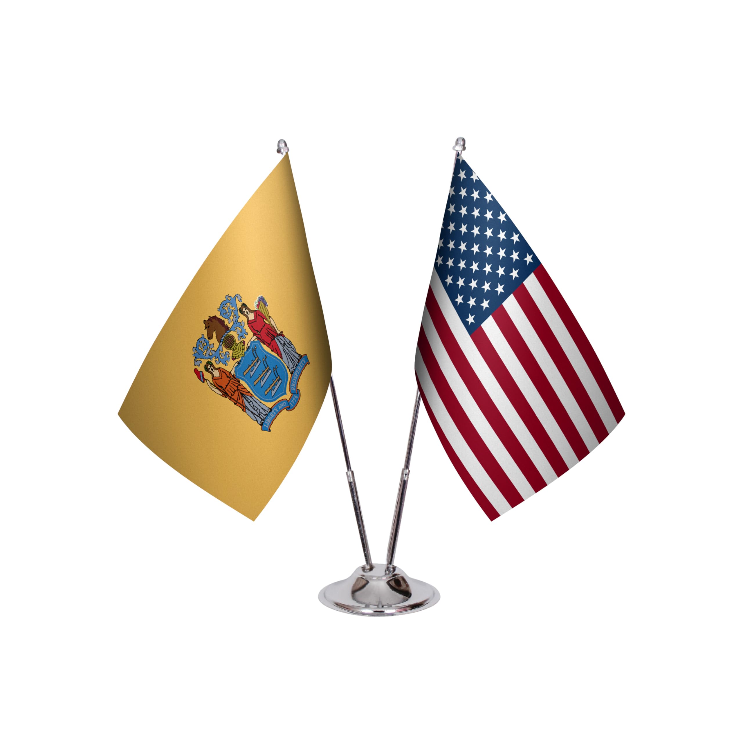 Célébrez votre héritage et votre patriotisme avec cet ensemble de bureau drapeau du New Jersey et des États-Unis – une combinaison parfaite du drapeau de l'État et du drapeau américain côte à côte.